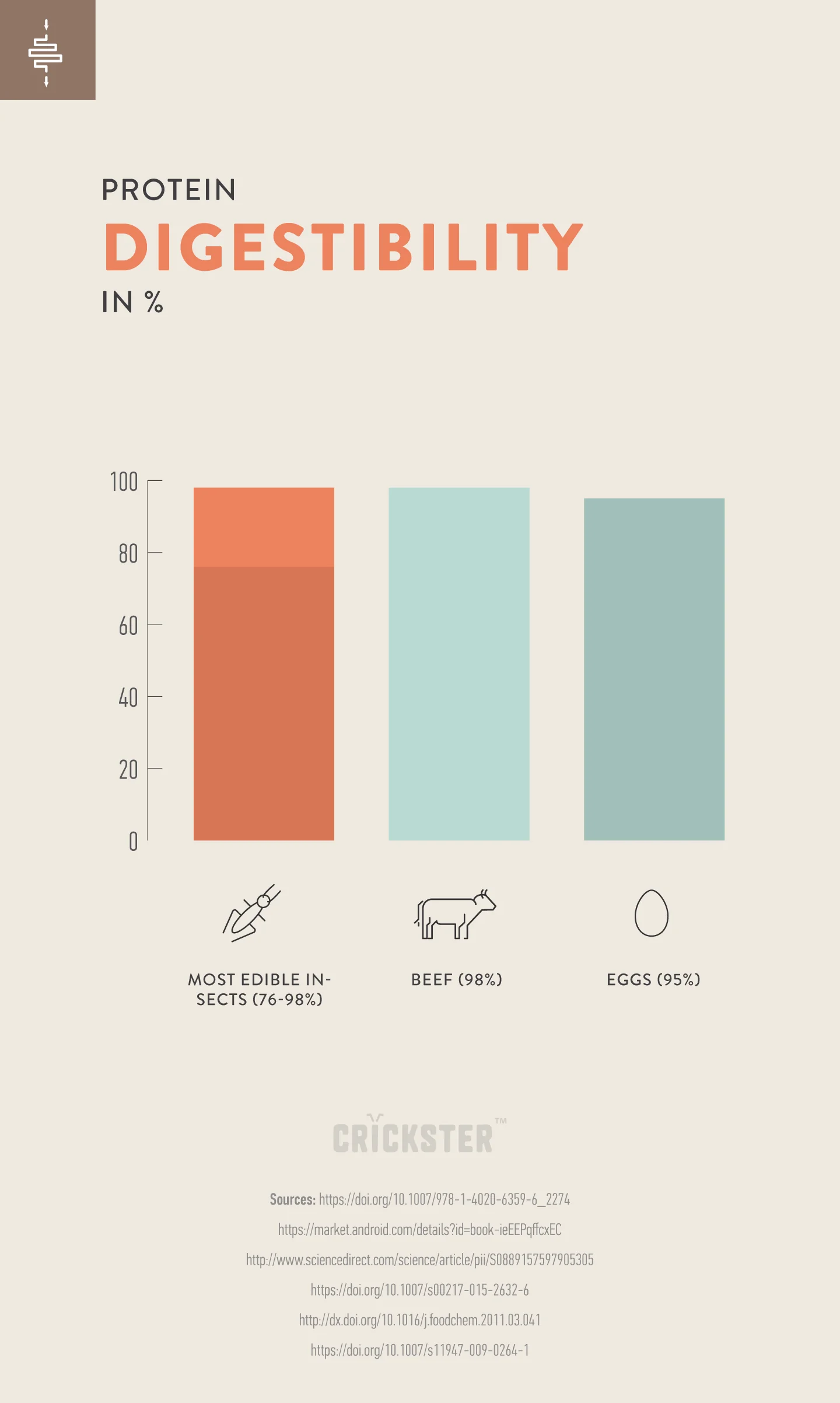Insect protein digestibility is the same or smaller than that egg protein and beef, but higher than most plant based sources.